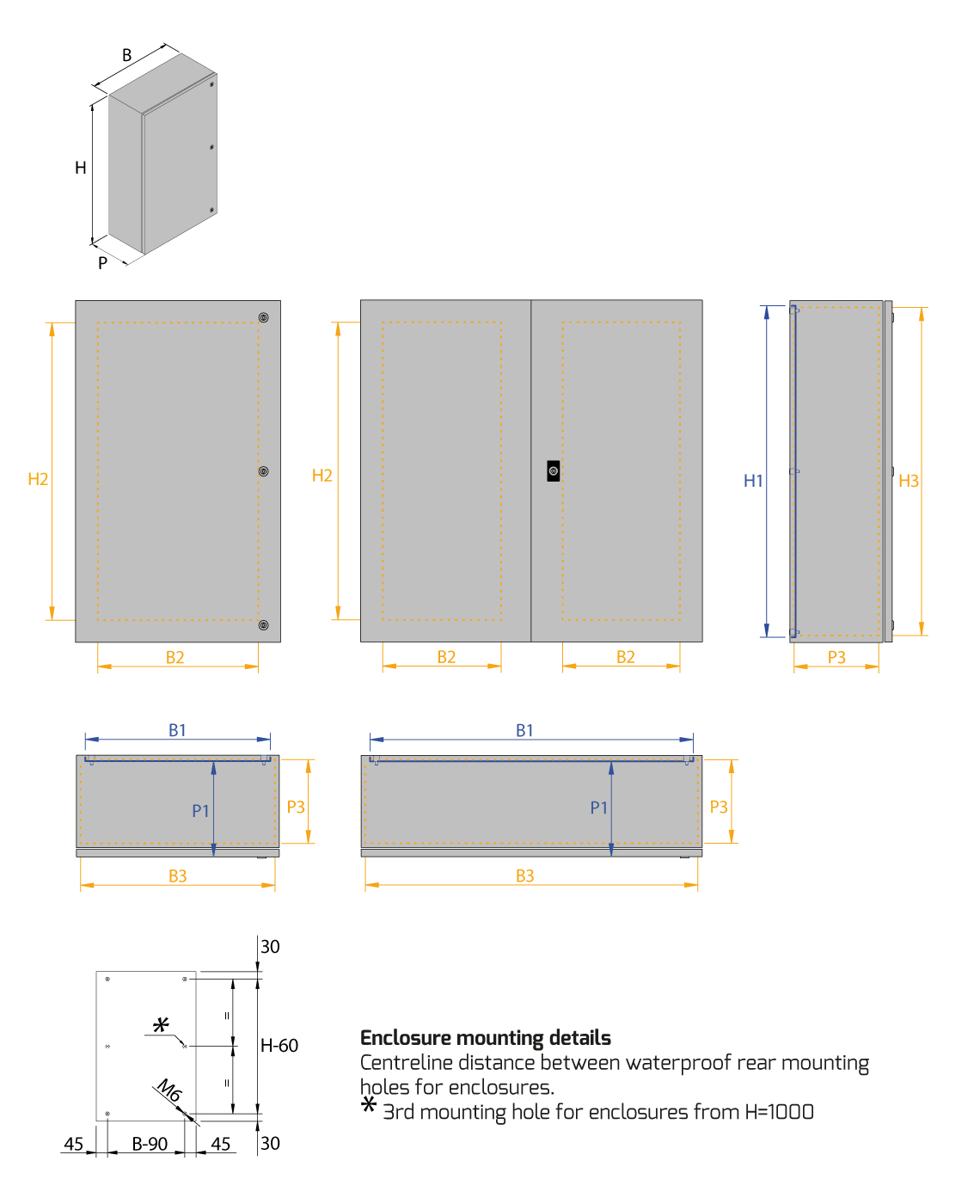 | Enclosure width | B | B1 | B2 | B3 |